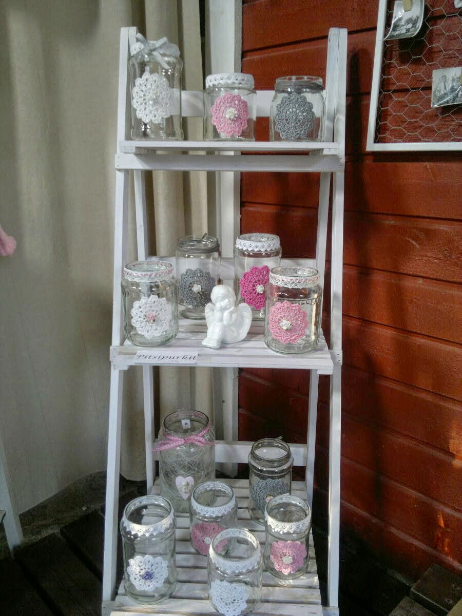 | Söpöt pitsipurkit, joissa edessä siskoni virkkaama pitsi. Hintaan vain 4e/kpl |