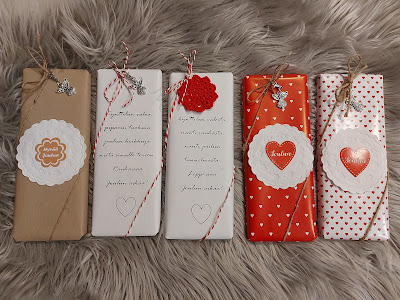 Tämä pieni makea muistaminen ei vamastikaan jää kaappiin pölyttymään. Sisällä Fazerin sininen suklaalevy. Rusetissa käsinvirkattu pitsi tai enkelikoru, 5,50.